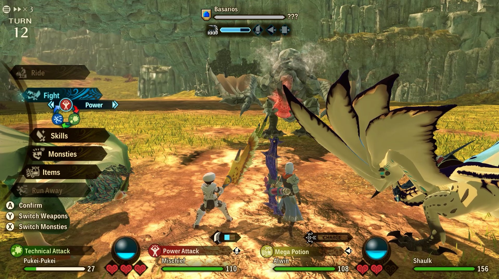 You and your team of up to six monsties face off against the wider roster of Monster Hunter monsters in turn-based fashion where you'll take advantage of three attack types in rock-paper-scissors style match ups. Of the three attack types, Speed beats Power, Power beats Technical, and Technical completes the cycle by beating Speed.